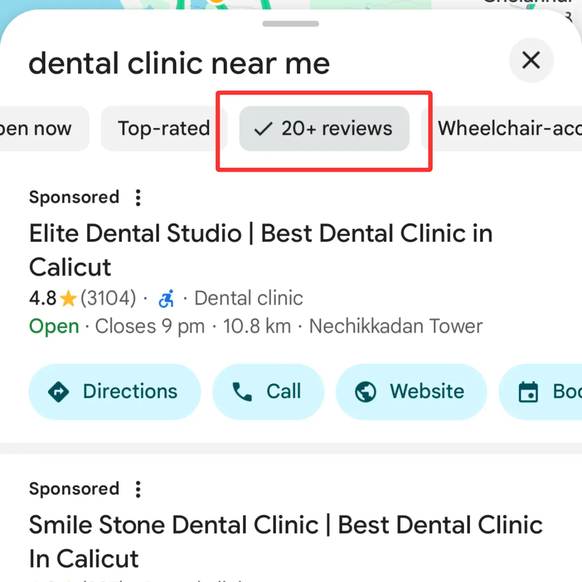 - Google analyzes the review counts of all the top-ranking businesses in a specific area (e.g., Dental Clinics in Calicut).