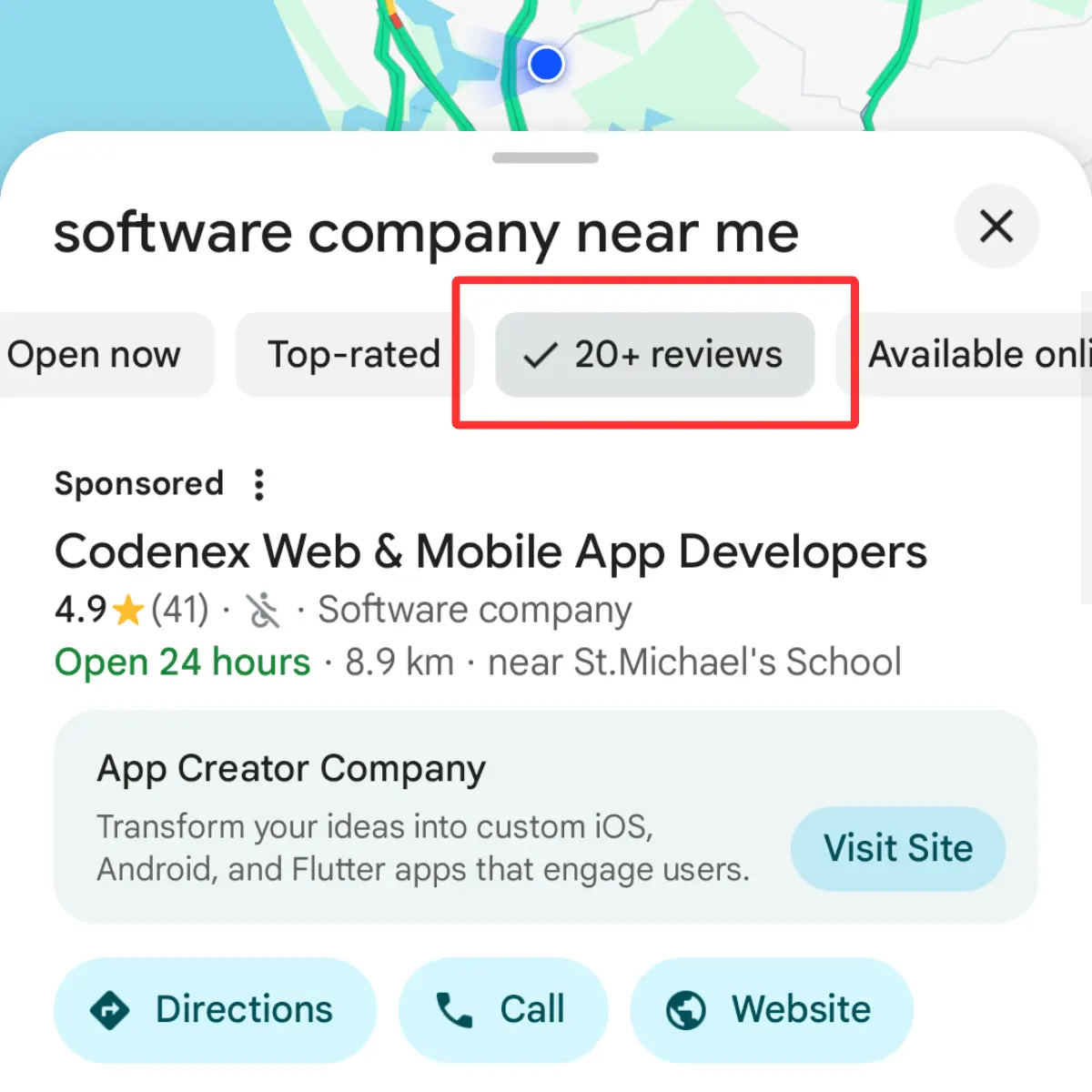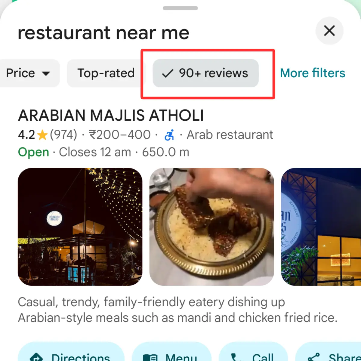 - It then creates a filter box at the top of the search results (e.g., "50+ Reviews" or "100+ Reviews").